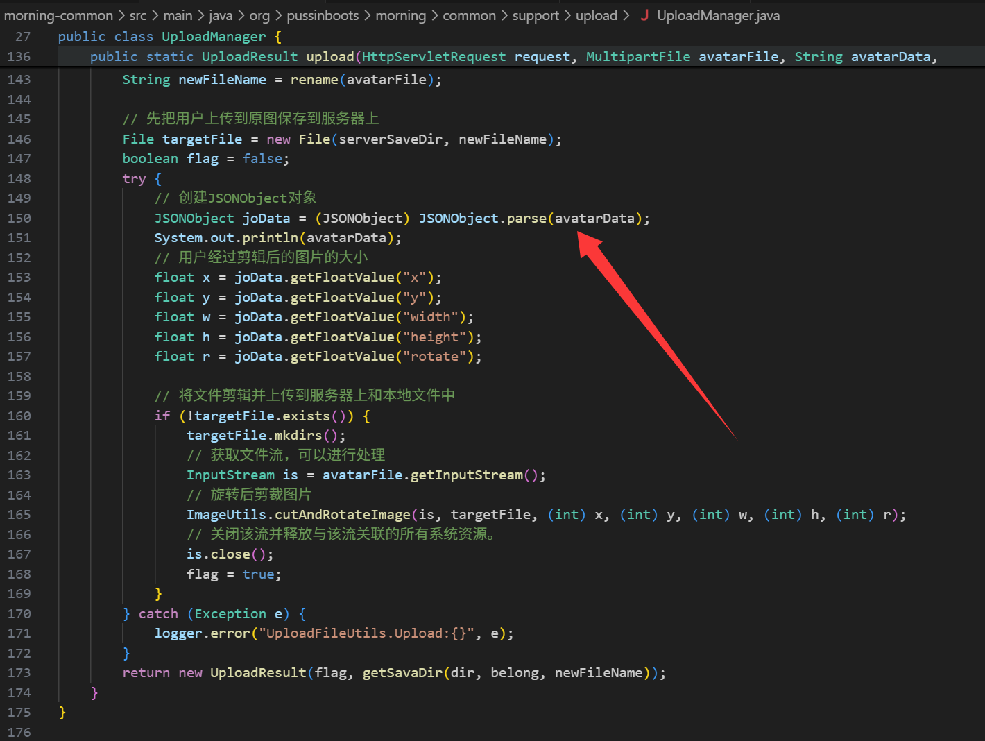 The method UploadManager.upload will use JSONObject.parse to parse user-supplied JSON metadata `avatar_data` using Alibaba Fastjson.